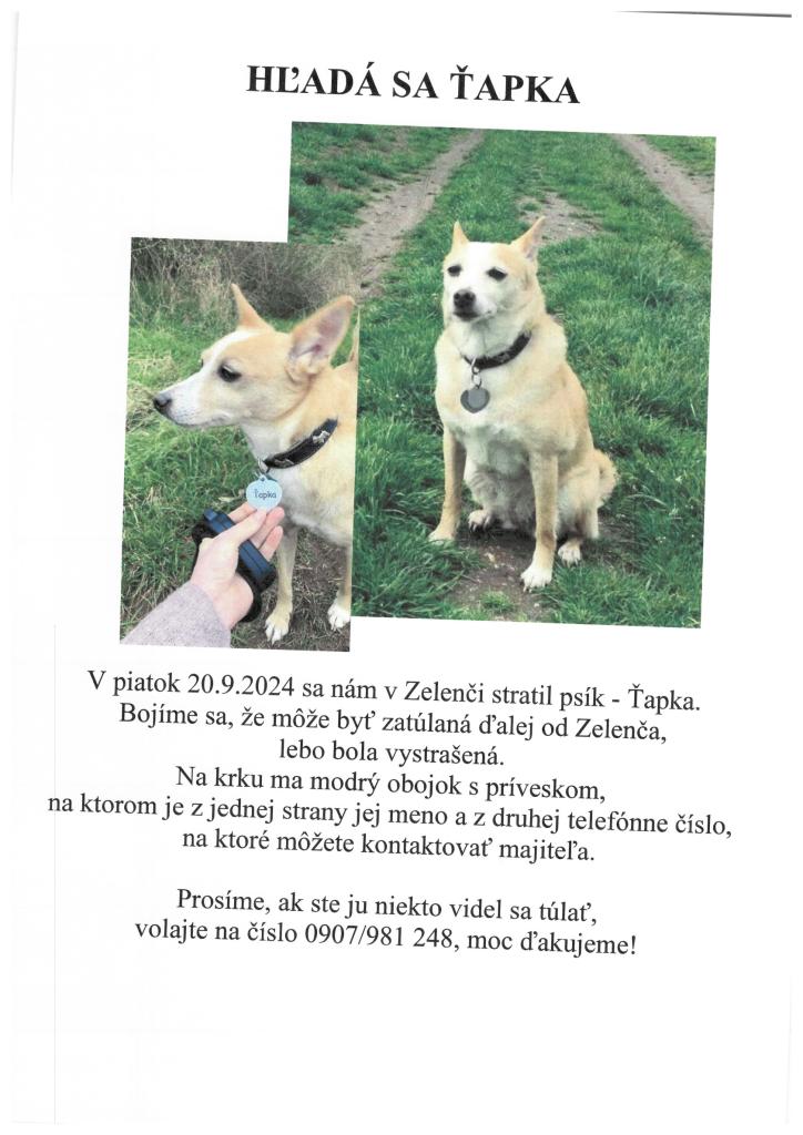 Stratil sa psík, ak ste ho videli, volajte 0907 981 248. Ďakujeme. Bližšie info v plagáte.
