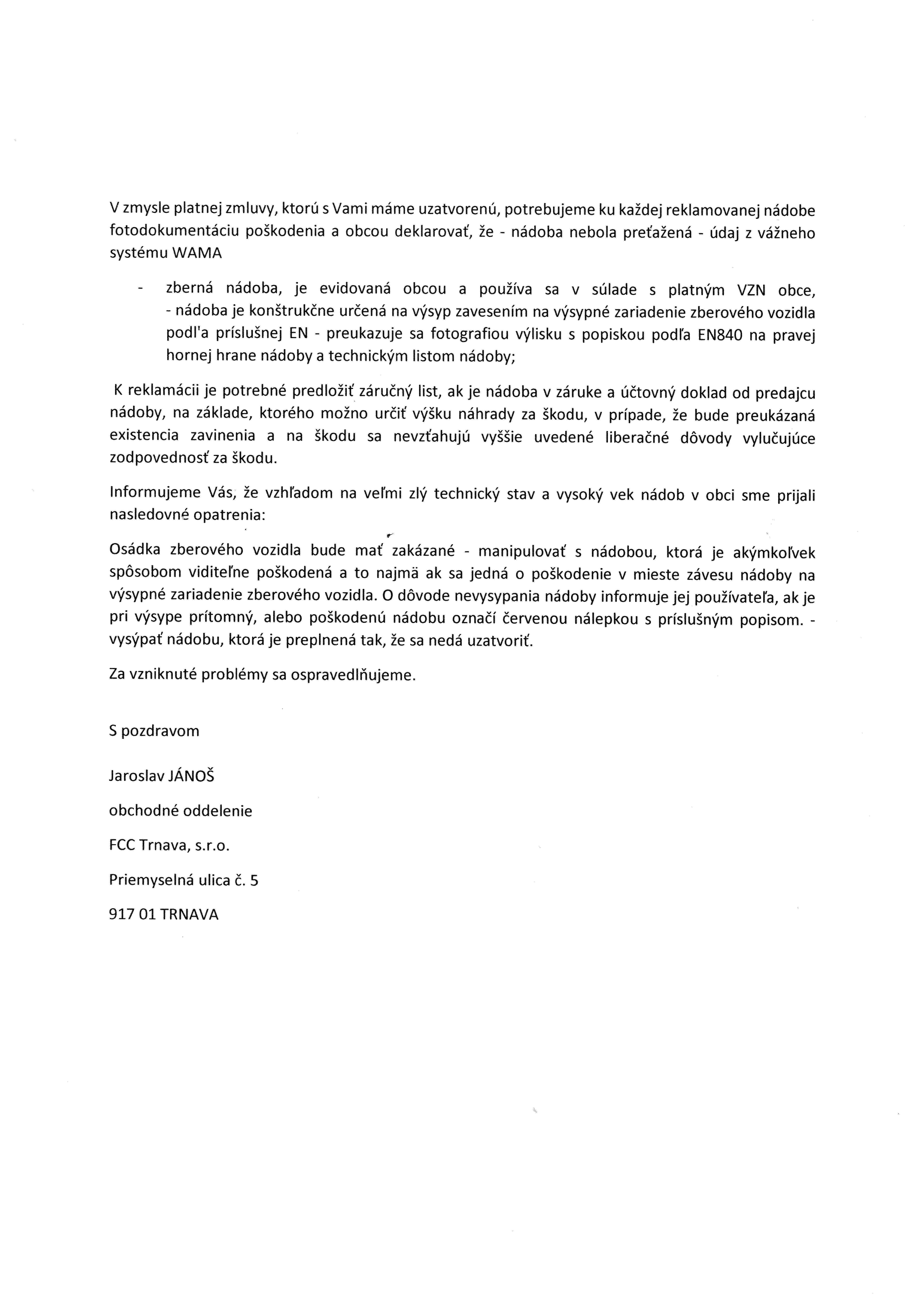V prílohe prikladáme vyjadrenie zvozovej spoločnosti FCC ohľadom poškodených nádob na KO v obci a ich reklamácii obyvateľmi.