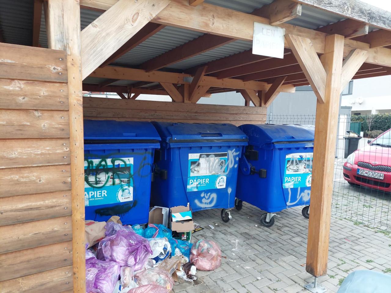 Avšak sme zistili, že ide o komunálny odpad a plienky. Okrem toho, kontajnery na papier sú nenaplnené a papierové krabice sú položené vedľa kontajnera.