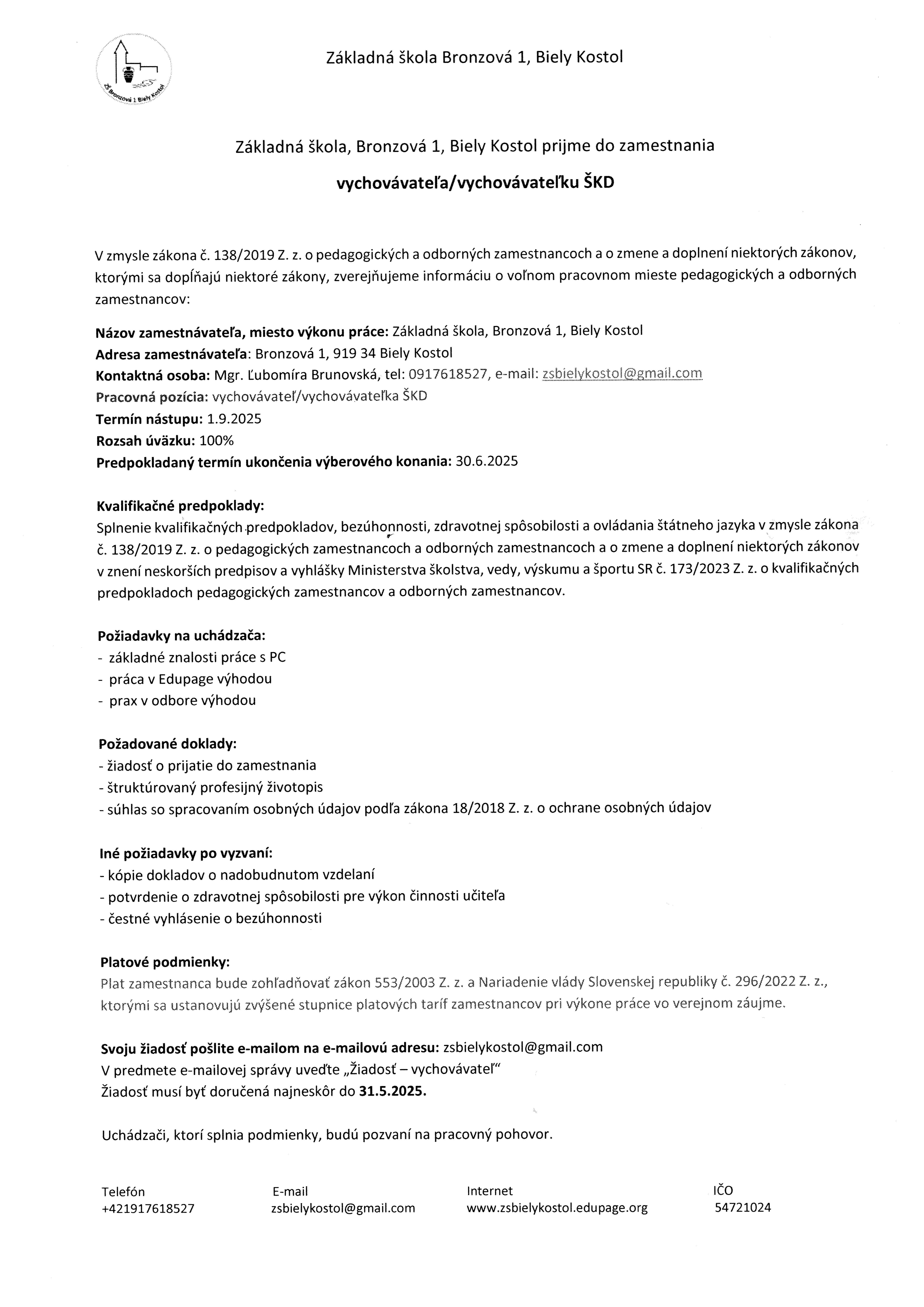 Aktuality - ZŠ Biely Kostol, Bronzová 1, Biely Kostol príjme do zamestnania vychovávateľa/vychovávateľku