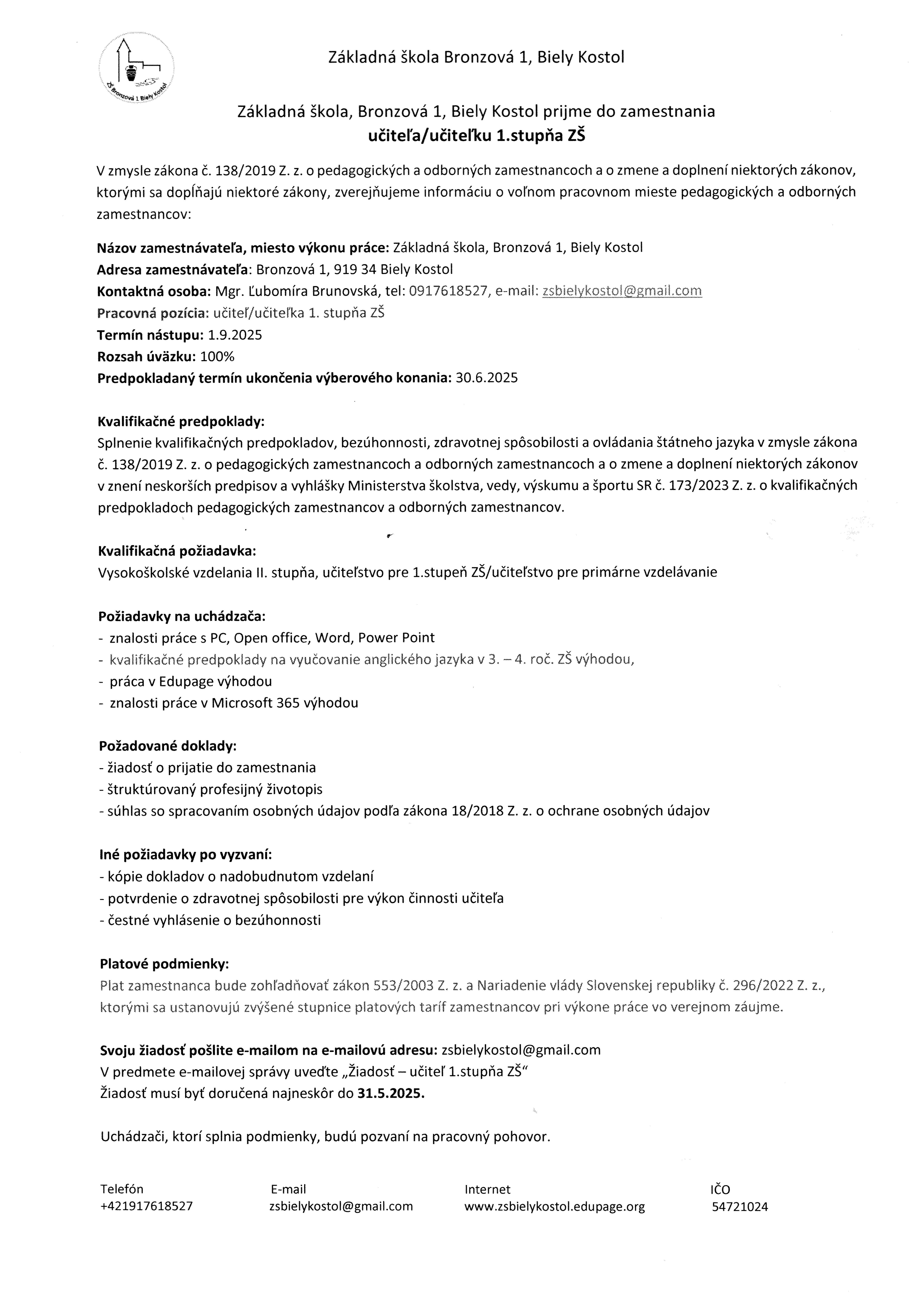 Aktuality - ZŠ Bronzová 1, Biely Kostol príjme do pracovného pomeru učiteľa/učiteľku pre 1. stupeň ZŠ