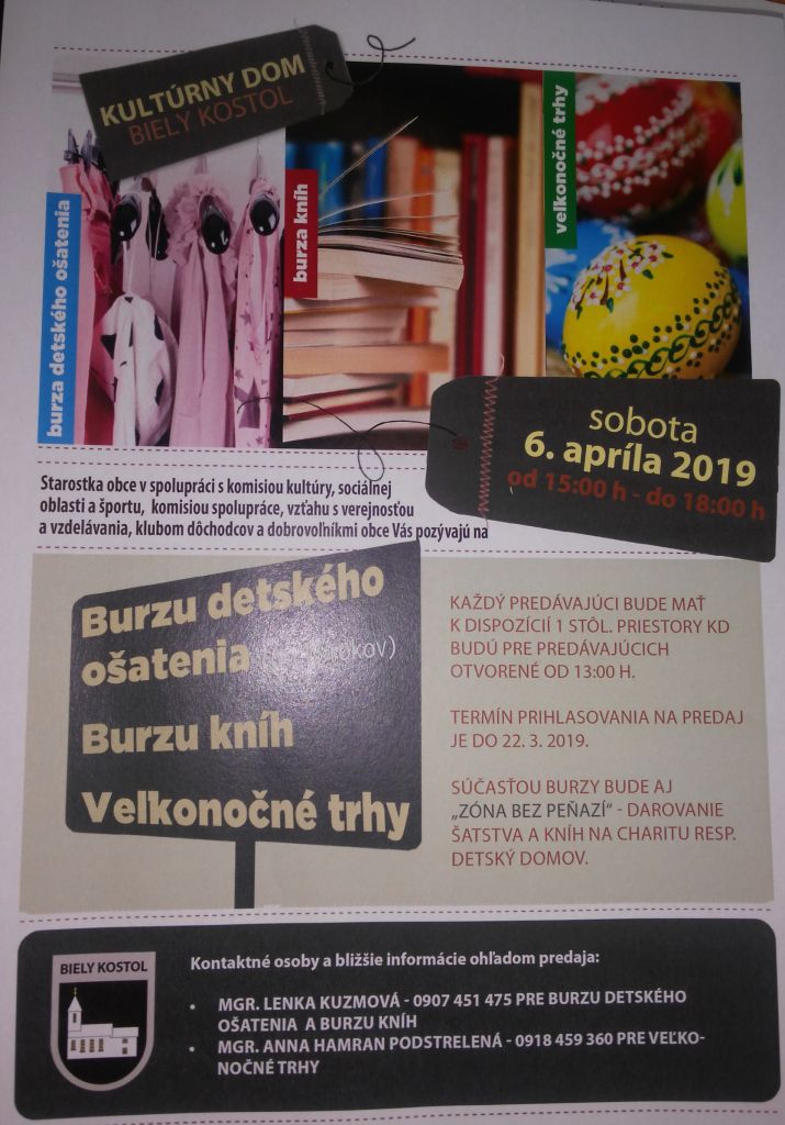 Starostka obce v spolupráci s komisiou kultúry, sociálnej oblasti a športu, komisiou spolupráce, vzťahu s verejnosťou a vzdelávania, klubom dôchodcov a dobrovoľníkmi obce Vás pozývajú v sobotu 6.4.2019 od 15:00 do 18:00 hod do Kultúrneho domu Biely Kostol na